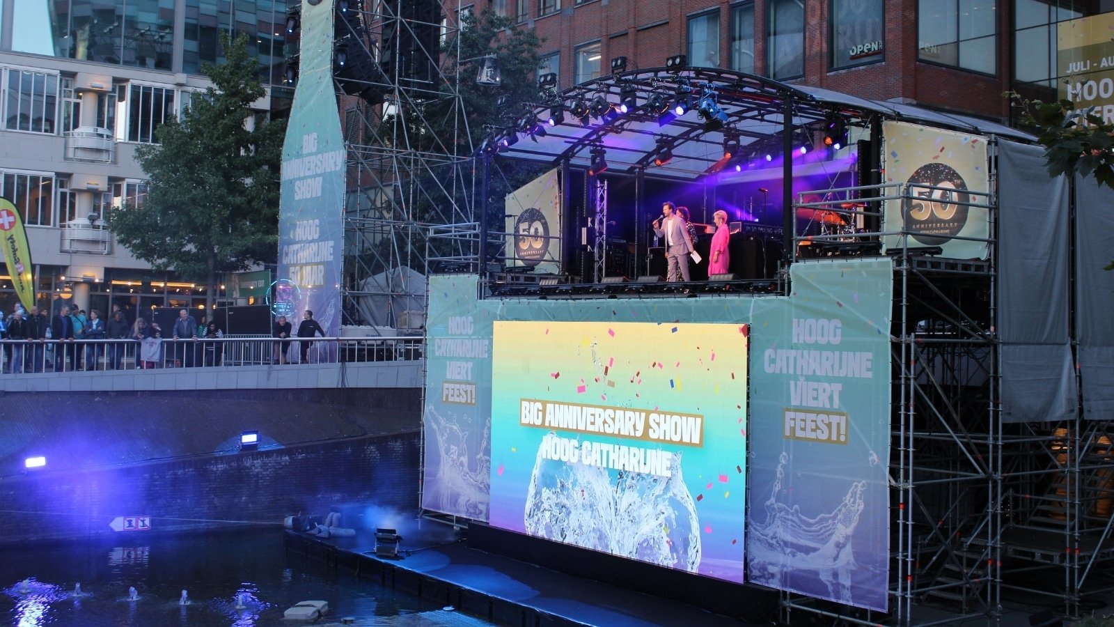 Op het water van de singel, ter hoogte van TivoliVredenburg, vond The Big Anniversary Show plaats: de feestelijke viering van het 50-jarig bestaan van Hoog Catharijne. Precies 50 jaar na de officiële opening door Prinses Beatrix op 24 september 1973, werd dit iconische winkelcentrum, dat jaarlijks meer dan 30 miljoen bezoekers ontvangt, groots in het zonnetje gezet. Voor dit bijzondere moment leverden wij een indrukwekkend LED-scherm van 8,0 × 4,5 meter, gemonteerd op een robuuste Layher-constructie. Omdat de eerste rijen bezoekers op ongeveer 15 meter afstand zaten, kozen we voor een pixel pitch van 3.9 mm, perfect voor haarscherpe weergave en optimale beleving op die afstand. Het scherm fungeerde als visueel middelpunt van het evenement en werd ingezet voor livebeelden, sfeerimpressies en presentaties. Hiermee droeg het sterk bij aan de feestelijke én professionele uitstraling van deze mijlpaal.